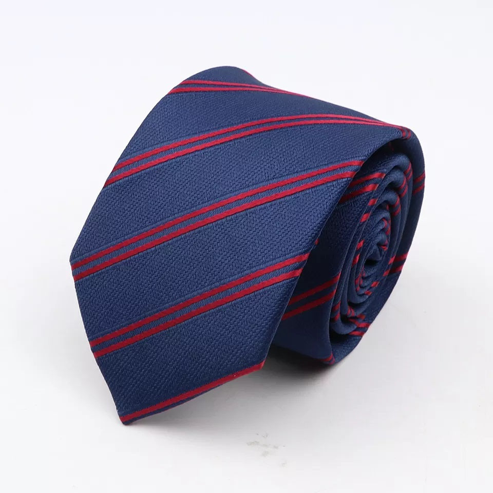 - Make a statement with this 7cm thin blue tie featuring a striking red stripe. Constructed of high-quality polyester, this classy tie offers the perfect blend of comfort and style to complete your look.