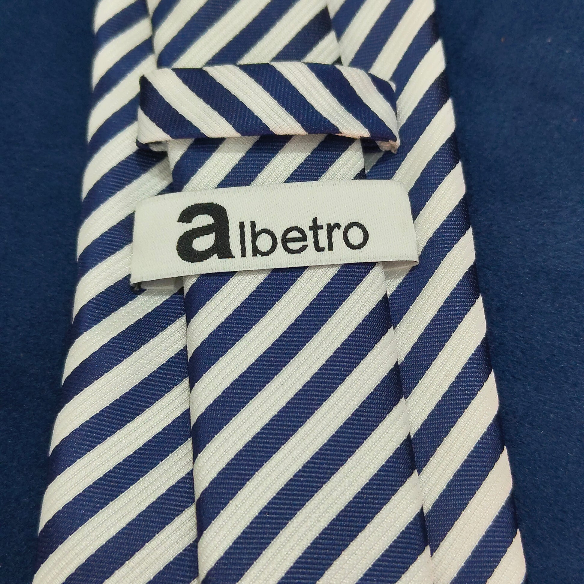 This tie is made of durable polyester material, ensuring long-lasting quality. With 1200 needles, it boasts a fine and intricate design, perfect for any formal occasion. Upgrade your style with this blue and white stripe tie.