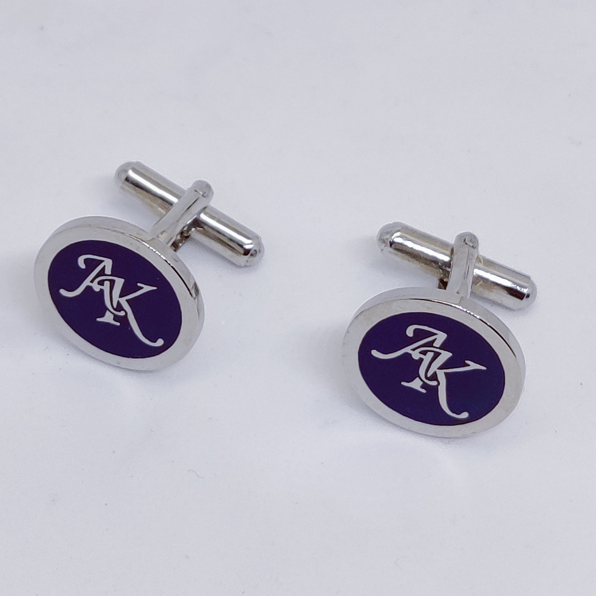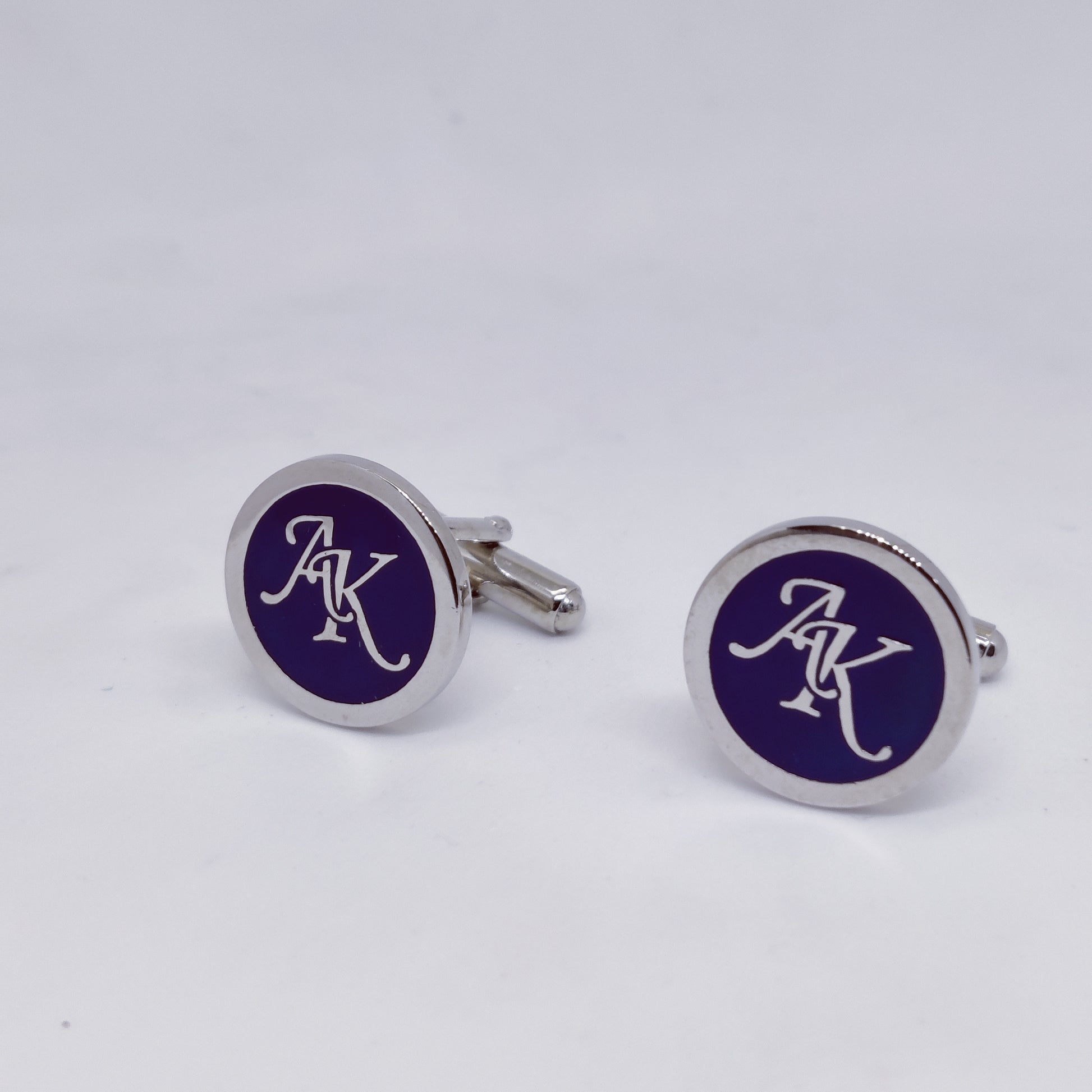 These AK initial monogram cufflinks are made from brass and silver plated with blue enamel. They are a sophisticated addition to any outfit and can add a touch of elegance to any suit or dress shirt. Crafted with quality materials, these cufflinks are sure to make a statement.