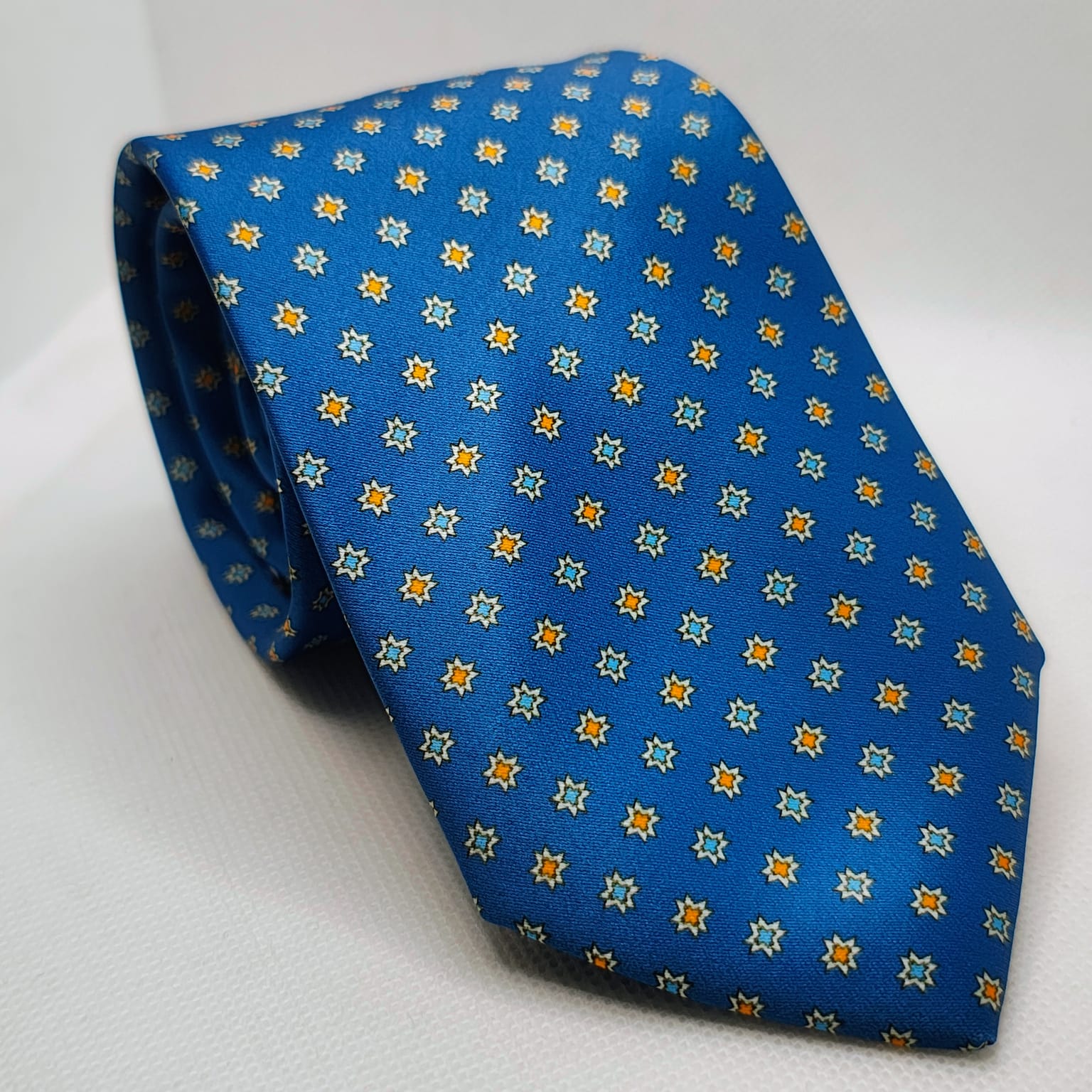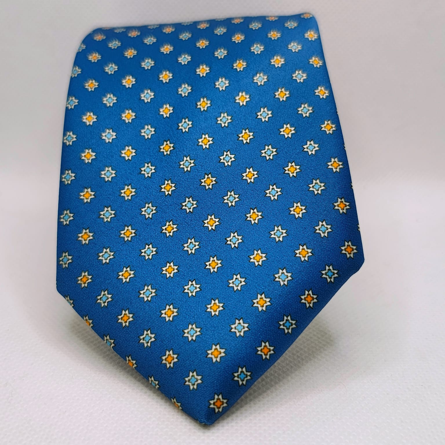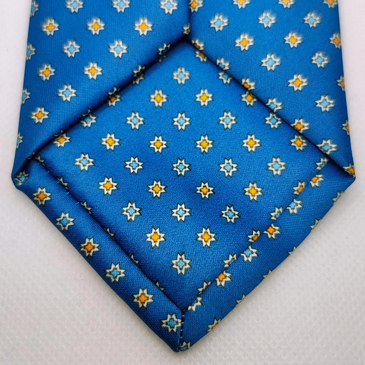 Stand out with subtle sophistication in our Azure Star Pattern Necktie. Featuring a striking blue base adorned with delicate star motifs in orange and white, this tie adds a refined yet stylish touch to your formal wardrobe.