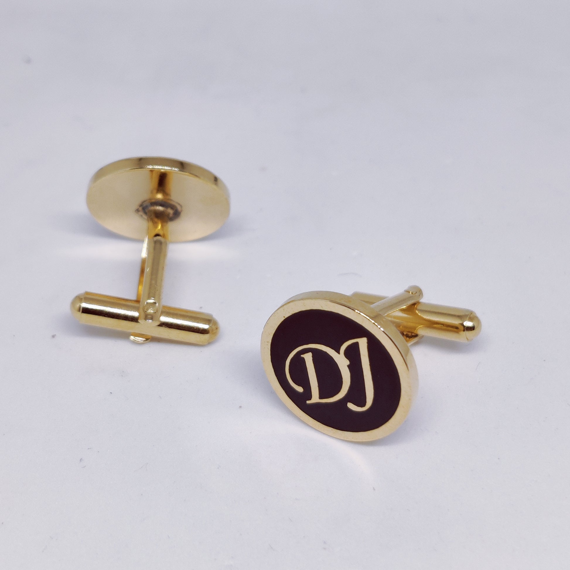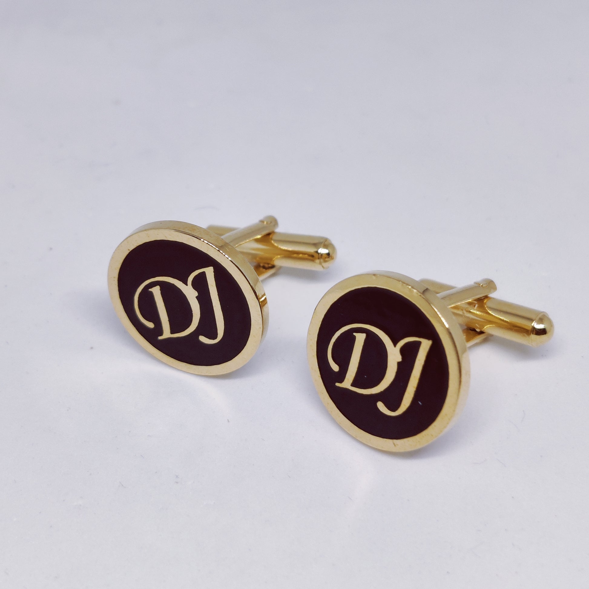 Expertly crafted from brass and finished in luxurious gold plating, these DJ Initial Monogram Cufflinks are a must-have for any stylish individual. The sleek design features a striking black enamel detail and adds a touch of sophistication to any outfit. Upgrade your accessory game with these elegant cufflinks.