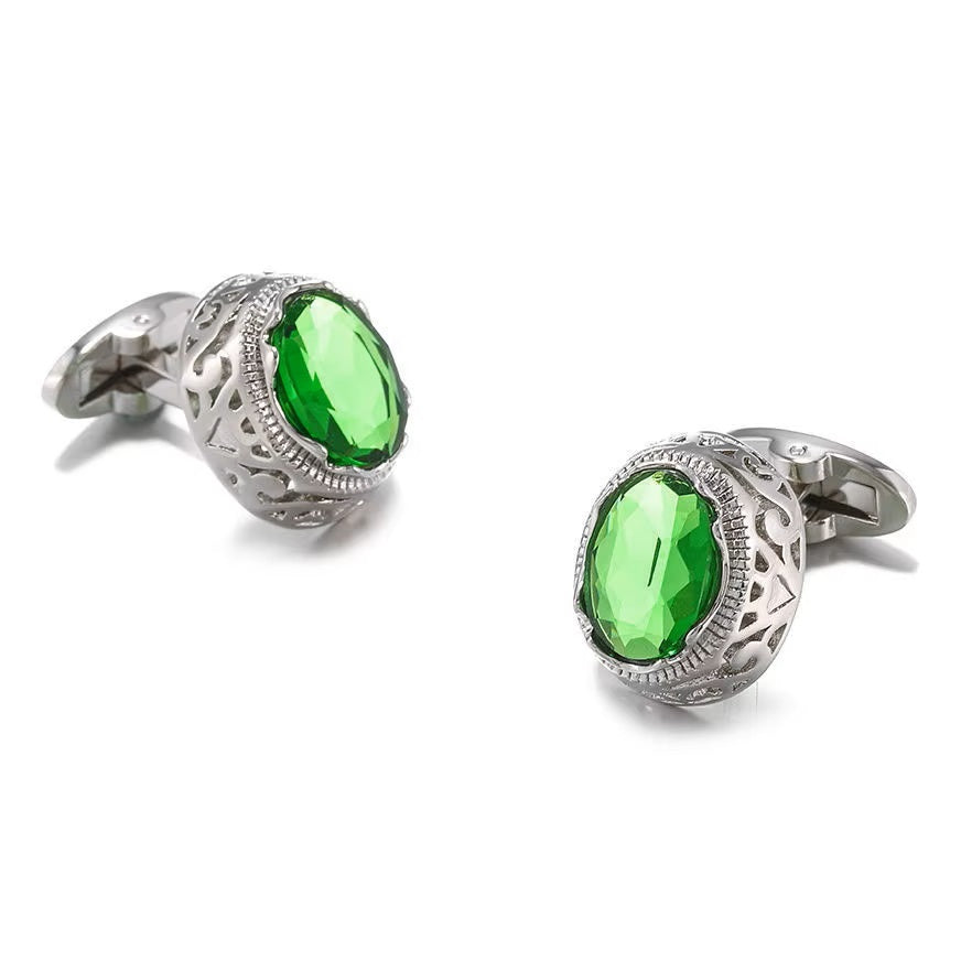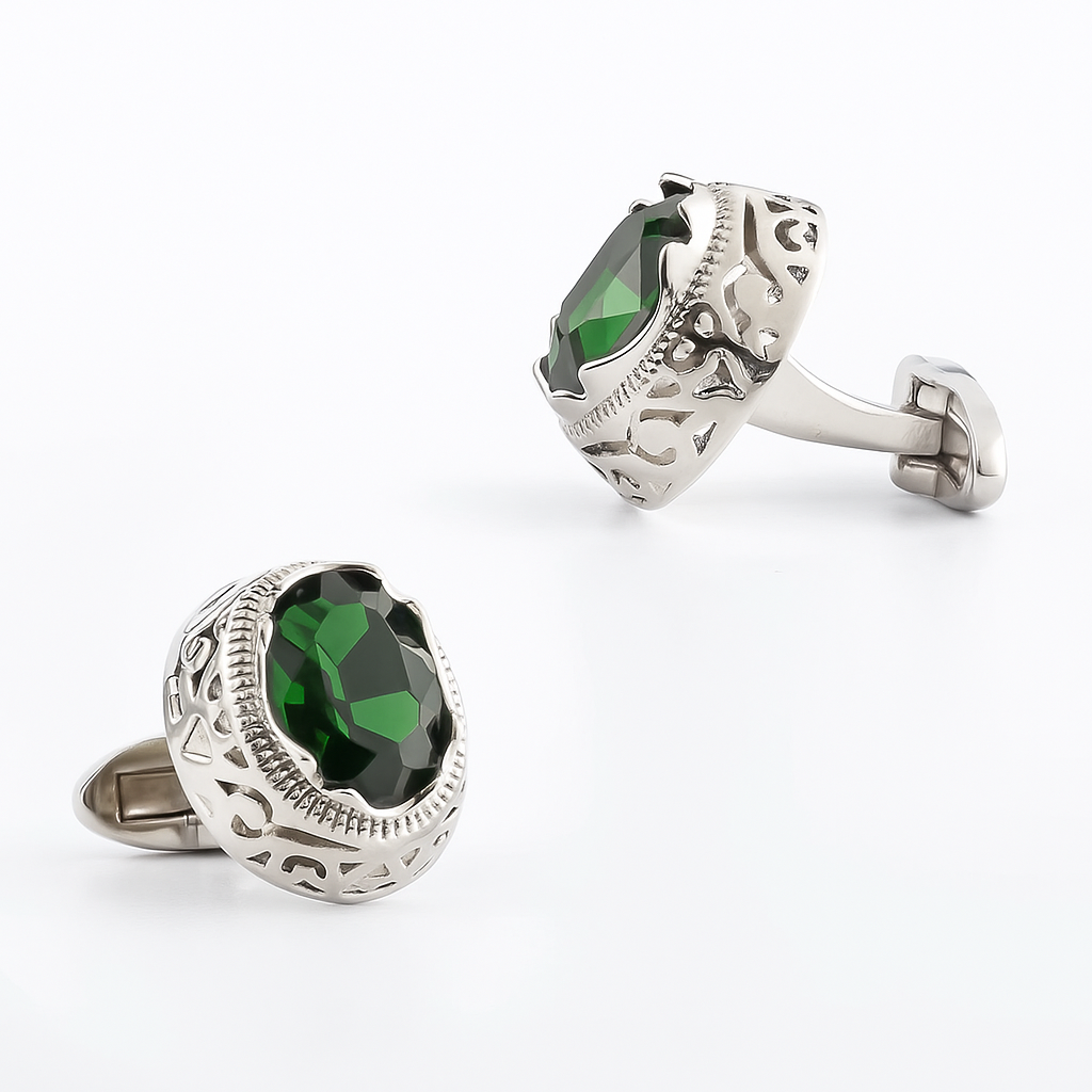 Command attention and exude refined elegance with the Emerald Majesty Cufflinks, a true masterpiece of sophisticated design. These cufflinks feature a captivating deep emerald-green faceted stone at the center, radiating a rich luster that catches the light beautifully from every angle. Perfect for gentlemen who appreciate fine craftsmanship, these cufflinks are a seamless blend of bold color, intricate detail, and luxurious appeal.