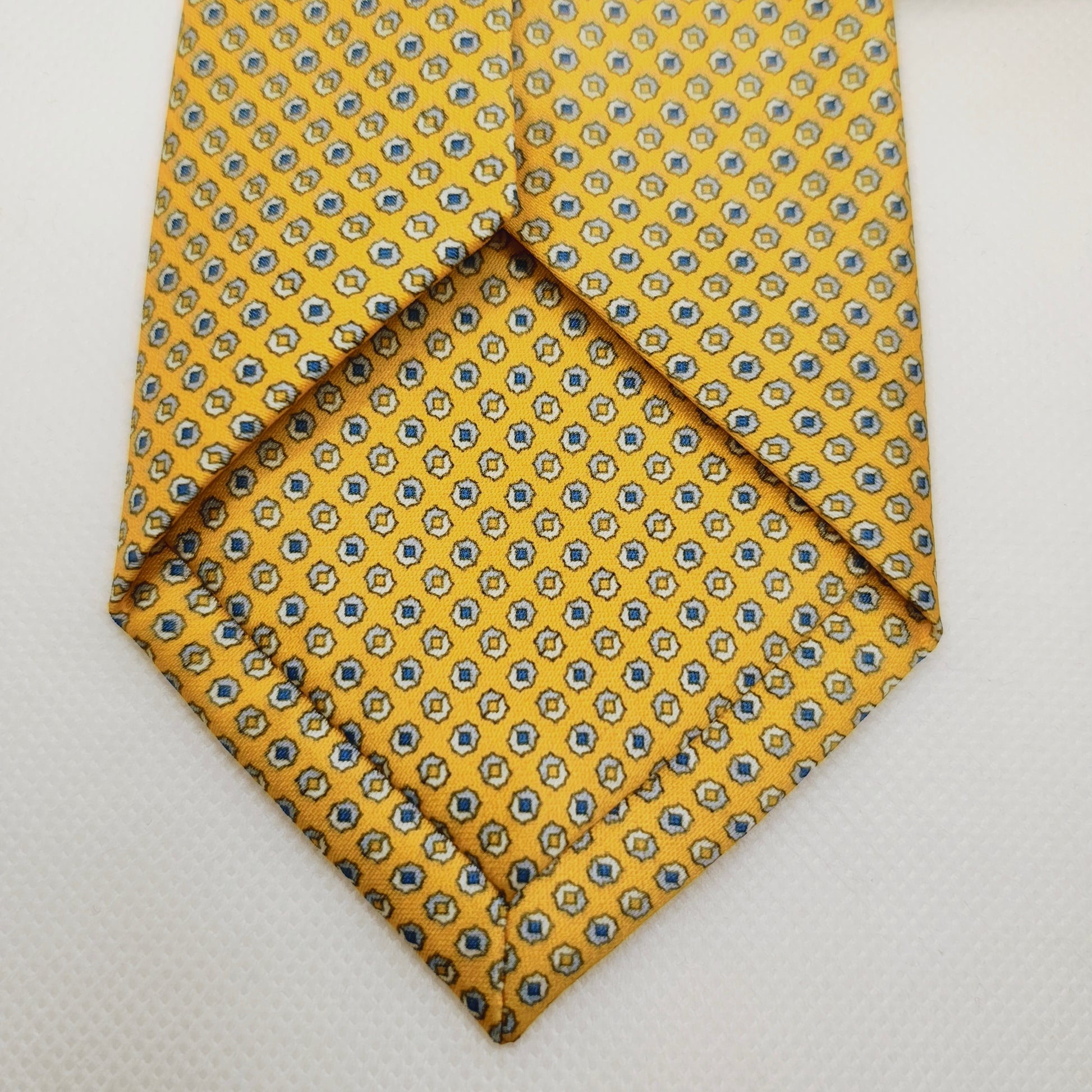 Elevate your formal style with the Golden Charm Geometric Tie, a perfect blend of sophistication and contemporary flair. Crafted from premium 1200-needle polyester, this tie offers a smooth, luxurious texture with exceptional durability. Featuring a striking golden-yellow base adorned with a refined blue-and-white geometric star pattern, it adds a vibrant yet classy touch to any outfit.
