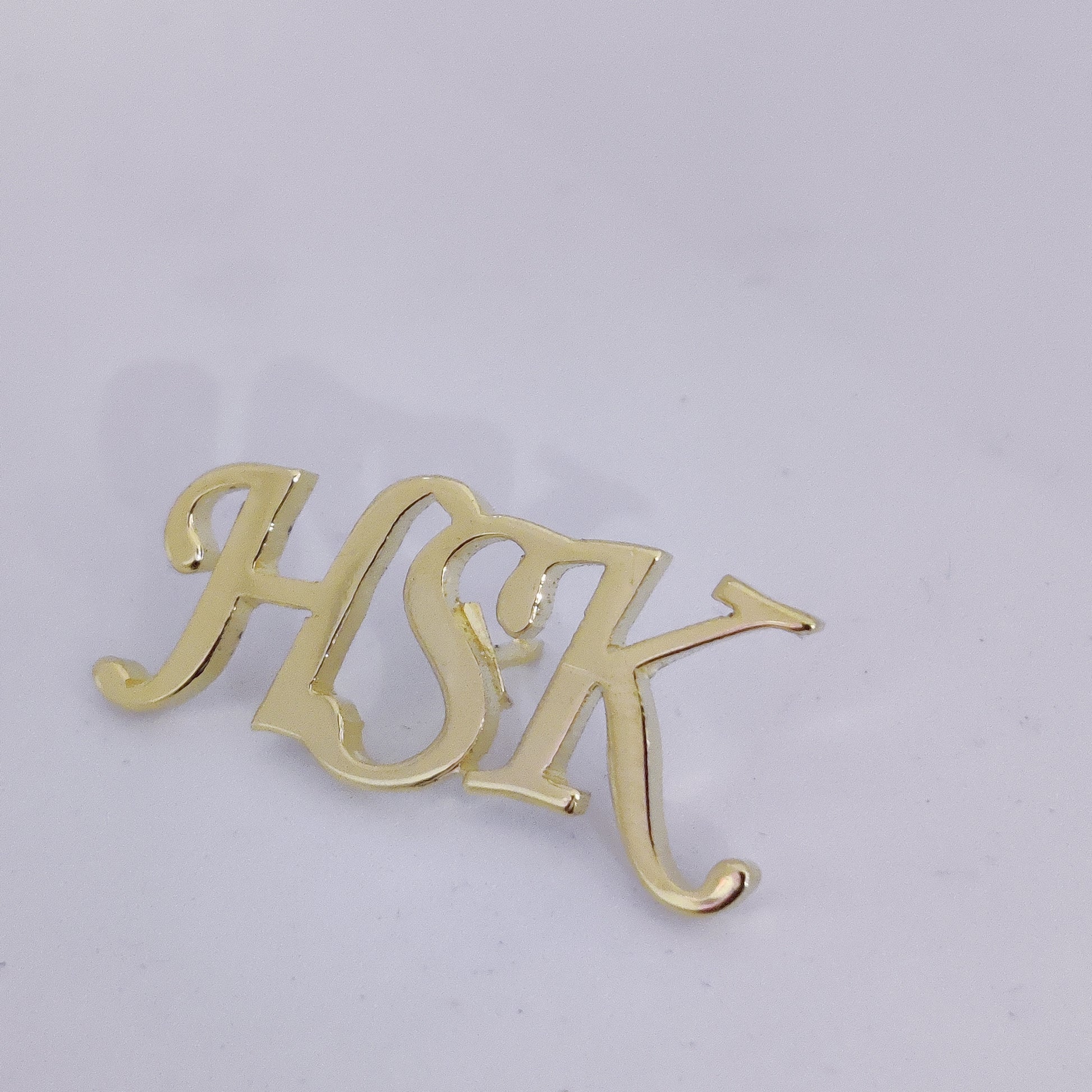 Expertly crafted from brass, the HSK Triple Initials lapel pin features a luxurious gold plating. Add a touch of elegance and sophistication to your outfit with this high-quality accessory. Perfect for showcasing your personal style in a professional and subtle manner.