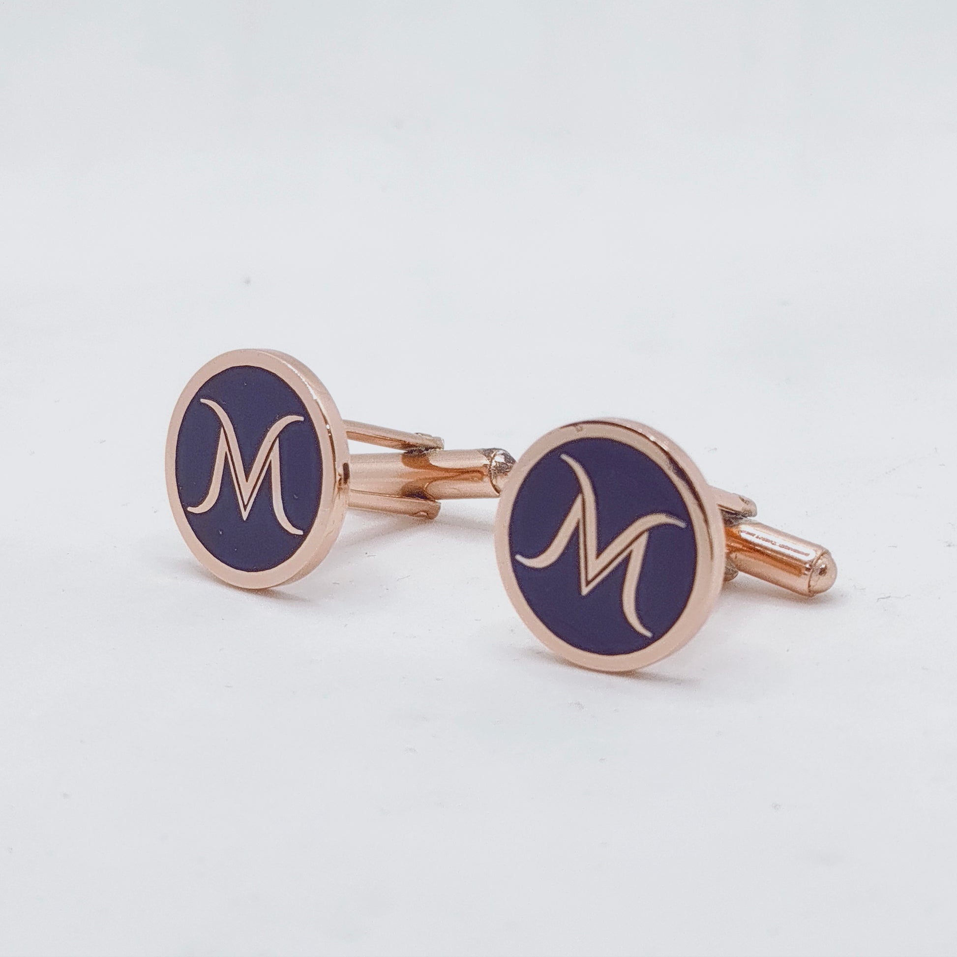 Add a touch of elegance and personalization to any outfit with our Initial M Monogram Cufflinks. The cufflinks feature a luxurious rose gold plating and a pop of color with black enamel, making them the perfect accessory for any occasion. Upgrade your style game with these sophisticated and unique cufflinks.