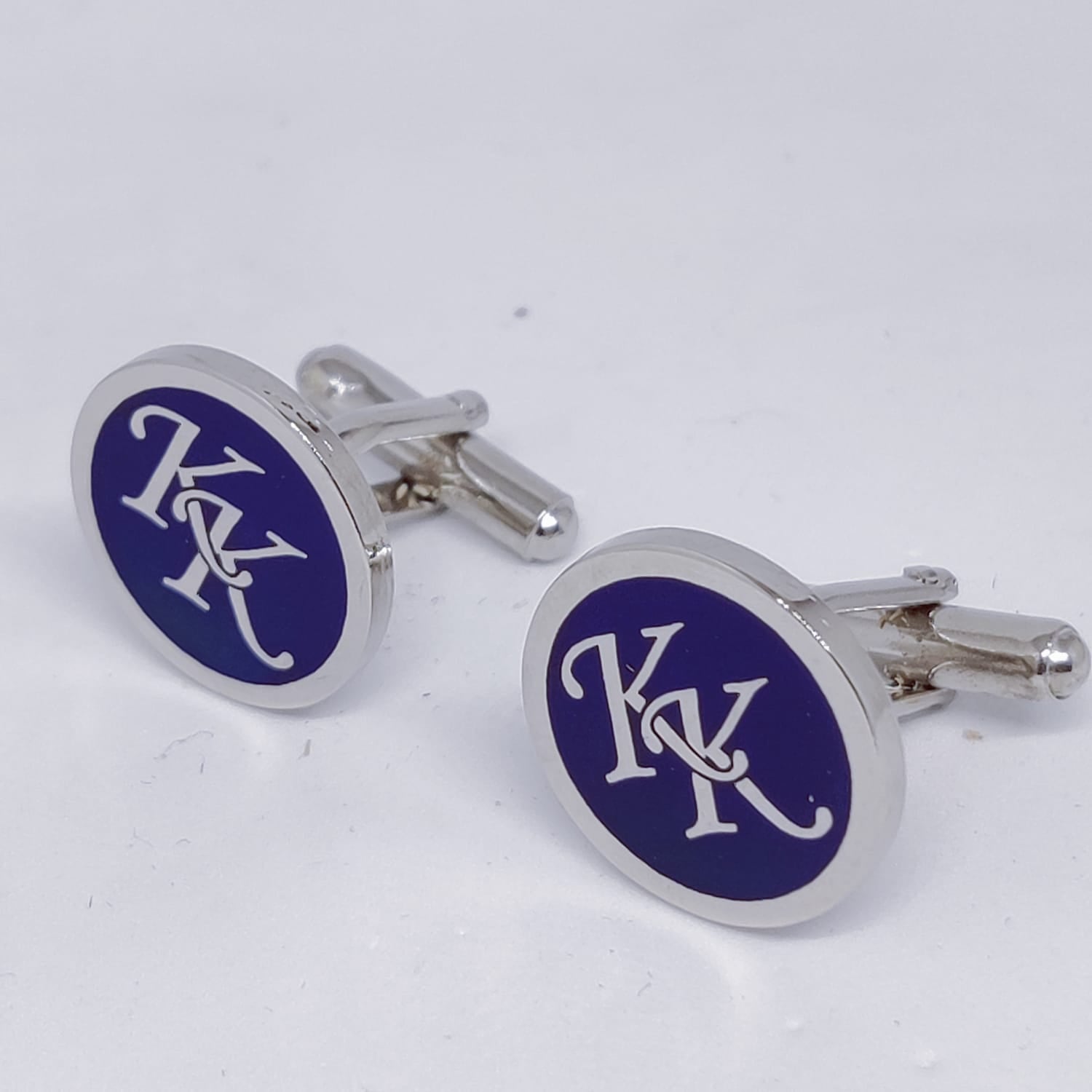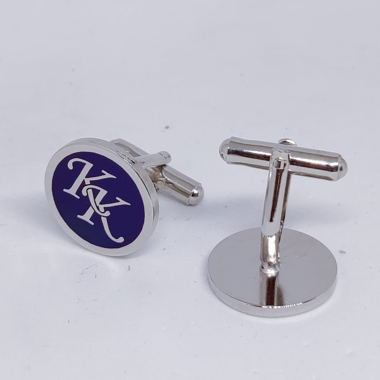 Crafted with precision, these KK Initial Monogram Cufflinks are made of brass and coated with silver for a sleek finish. The striking blue enamel adds a touch of color to your attire. Enhance your personal style and make a statement with these stylish cufflinks.