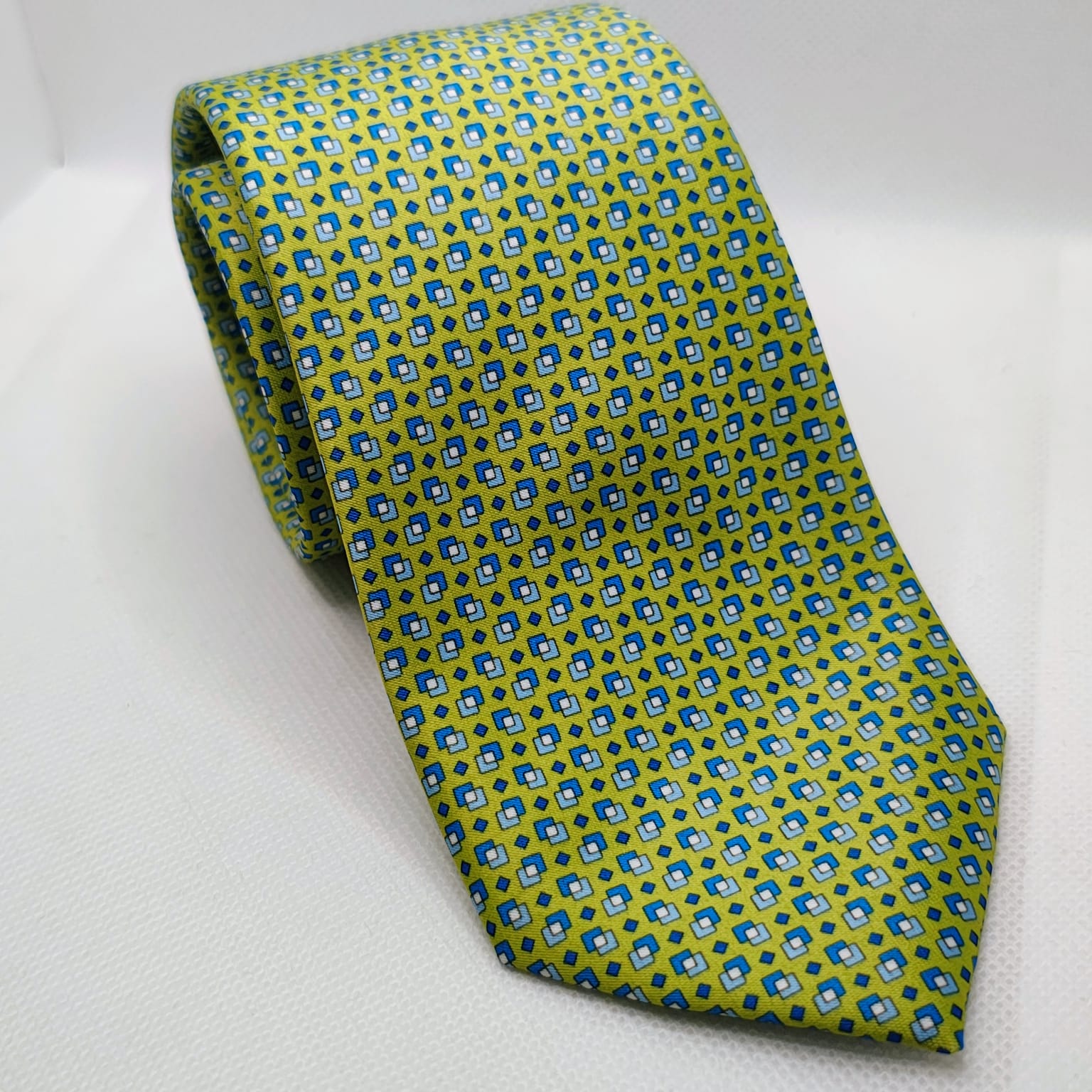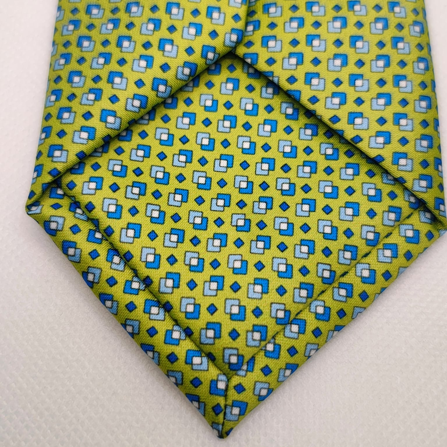 Brighten up your formal attire with the Lime Geometric Pattern Necktie, designed for men who aren’t afraid to make a stylish statement. Featuring a fresh lime-green base enhanced with blue and white geometric motifs, this tie brings a perfect balance of boldness and sophistication.