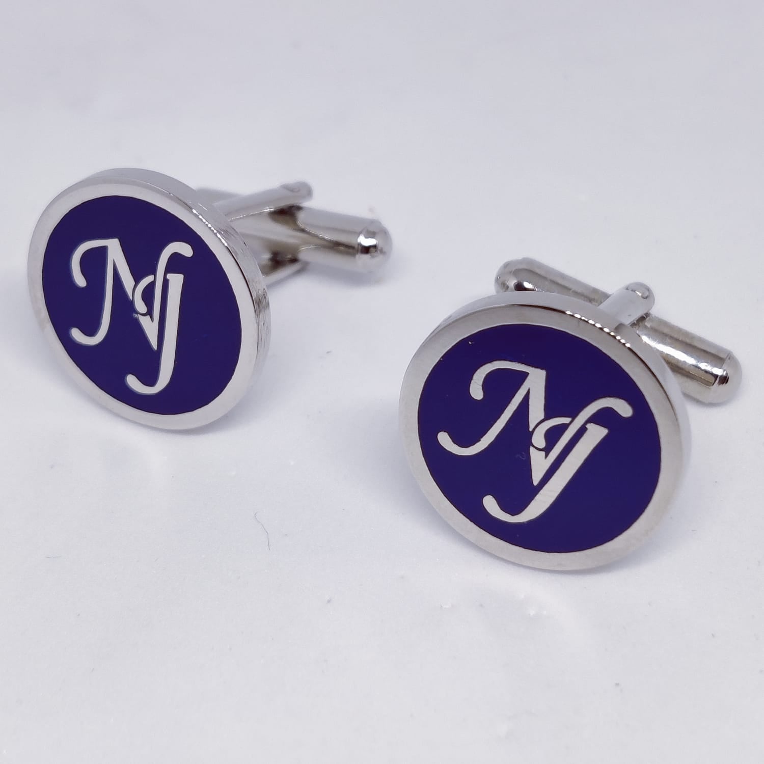 Expertly crafted from high-quality brass, these NJ initial monogram cufflinks are a sleek and stylish addition to any formal or business attire. The blue enamel and silver-plated design adds a touch of sophistication and personalization, making them the perfect accessory for any gentleman.