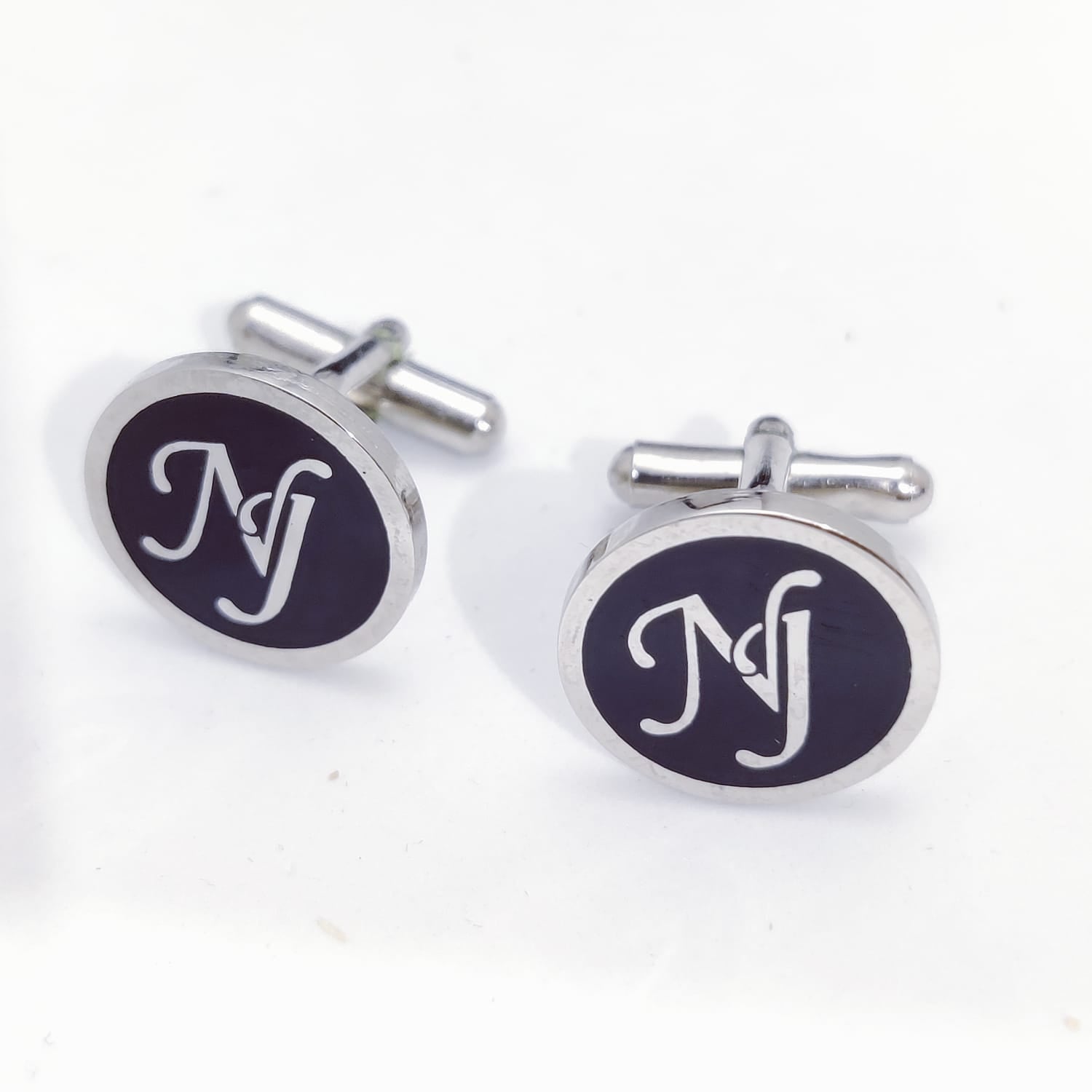 These cufflinks are made from brass and finished with silver plating for a sleek and sophisticated look. The black enamel adds a touch of color and personalization to these initials monogrammed cufflinks. Made with quality materials, these cufflinks are the perfect addition to any professional wardrobe.