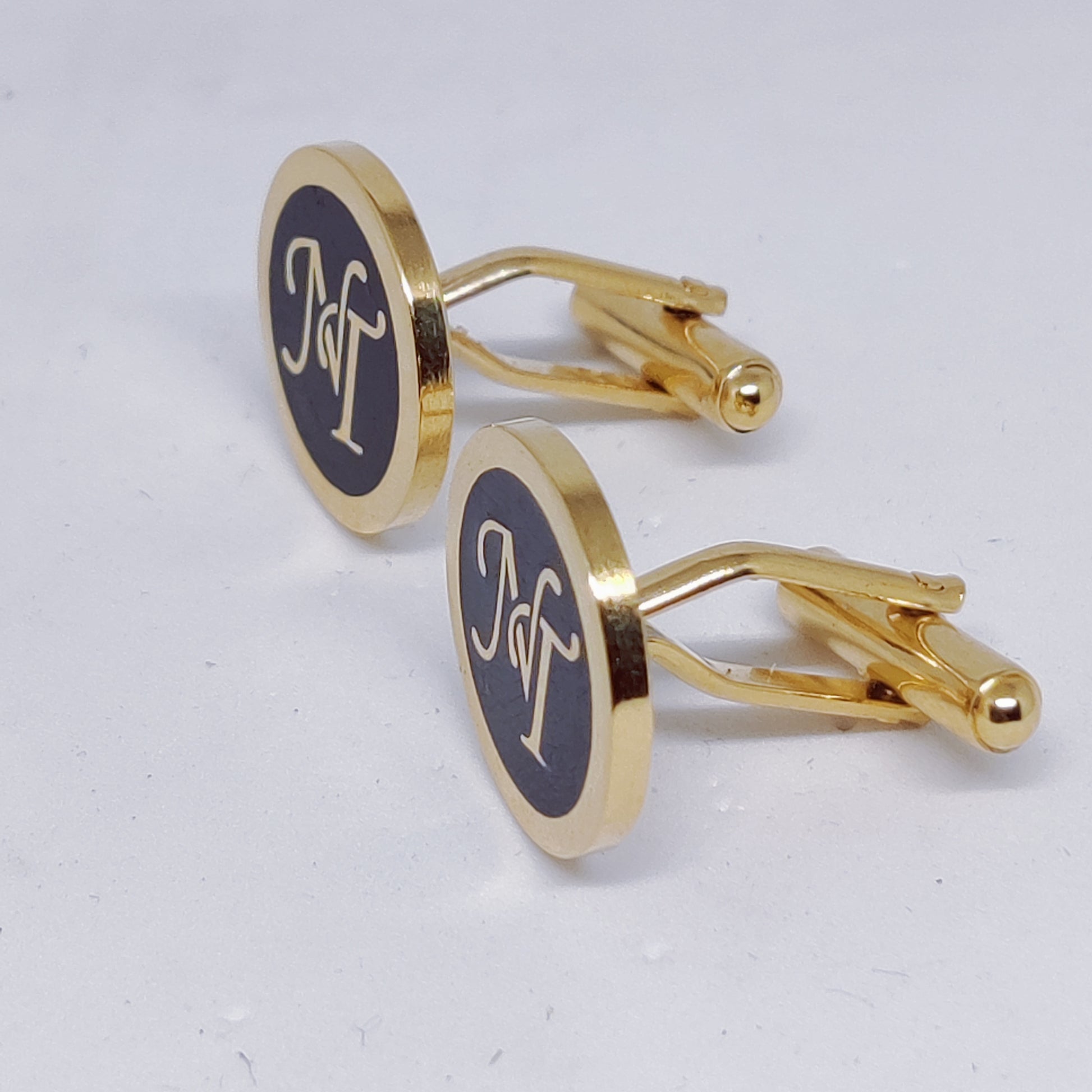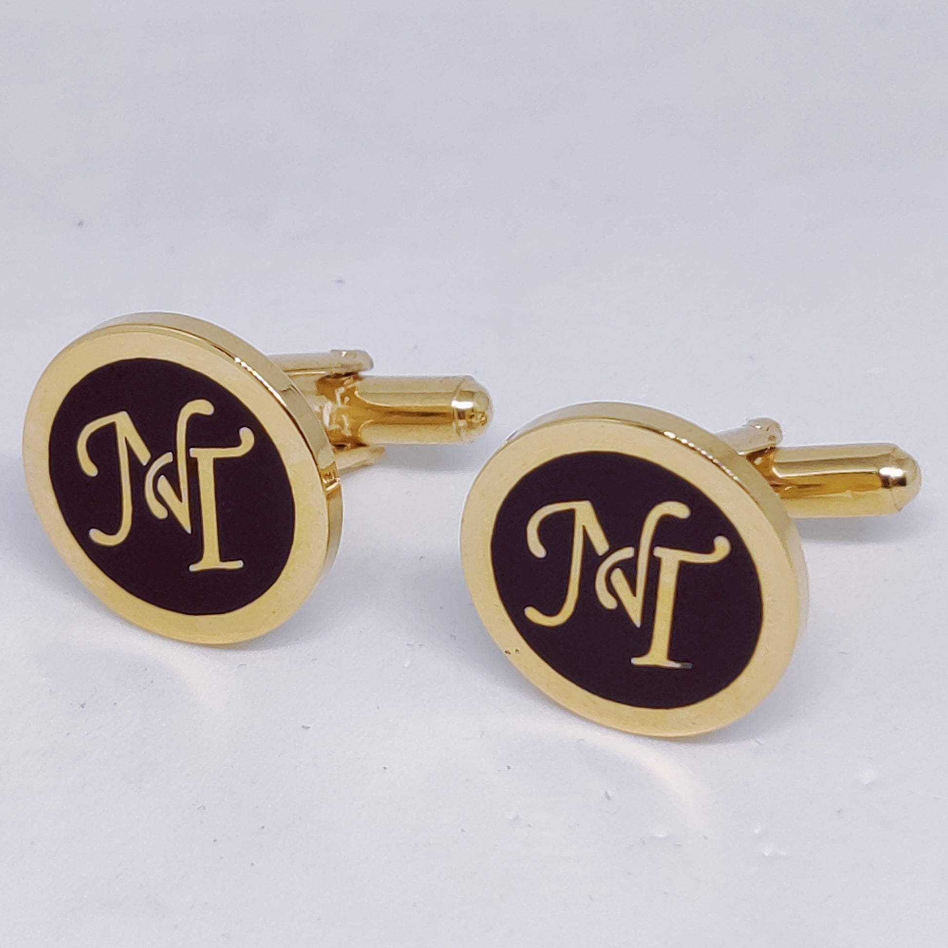 Crafted from brass and plated in gold, these monogram cufflinks feature a bold black enamel design. Elevate your formal attire with a touch of personalized sophistication.