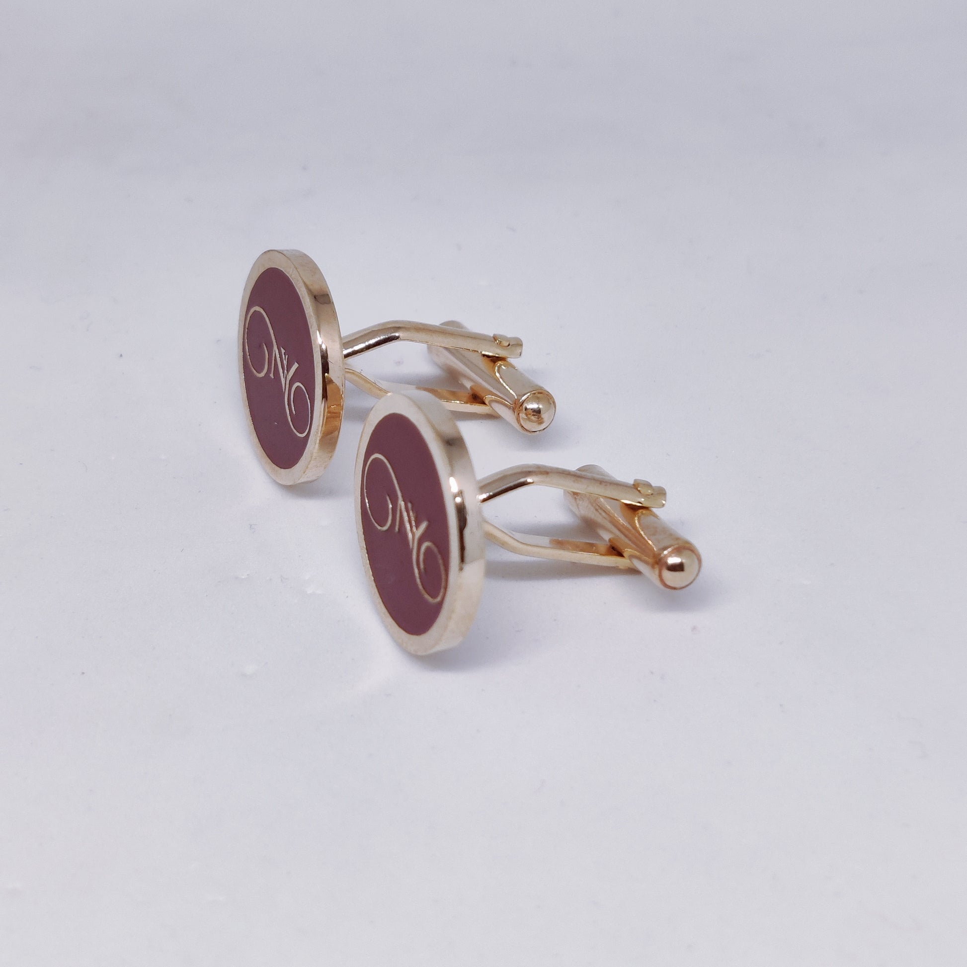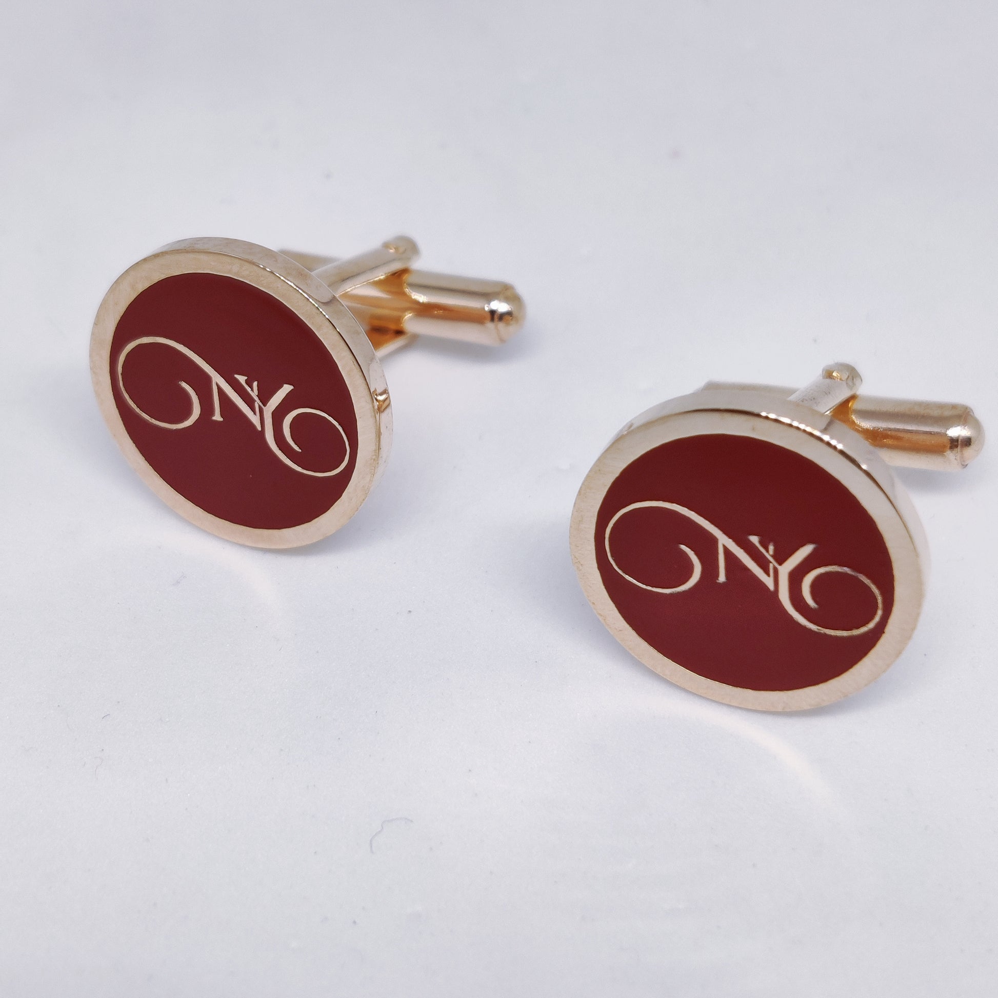 Experience sophistication with these NY initial monogram cufflinks. Made of brass with a luxurious rose gold finish, these cufflinks will elevate any formal outfit. The maroon enamel adds a touch of color and style, making them the perfect accessory for any occasion.