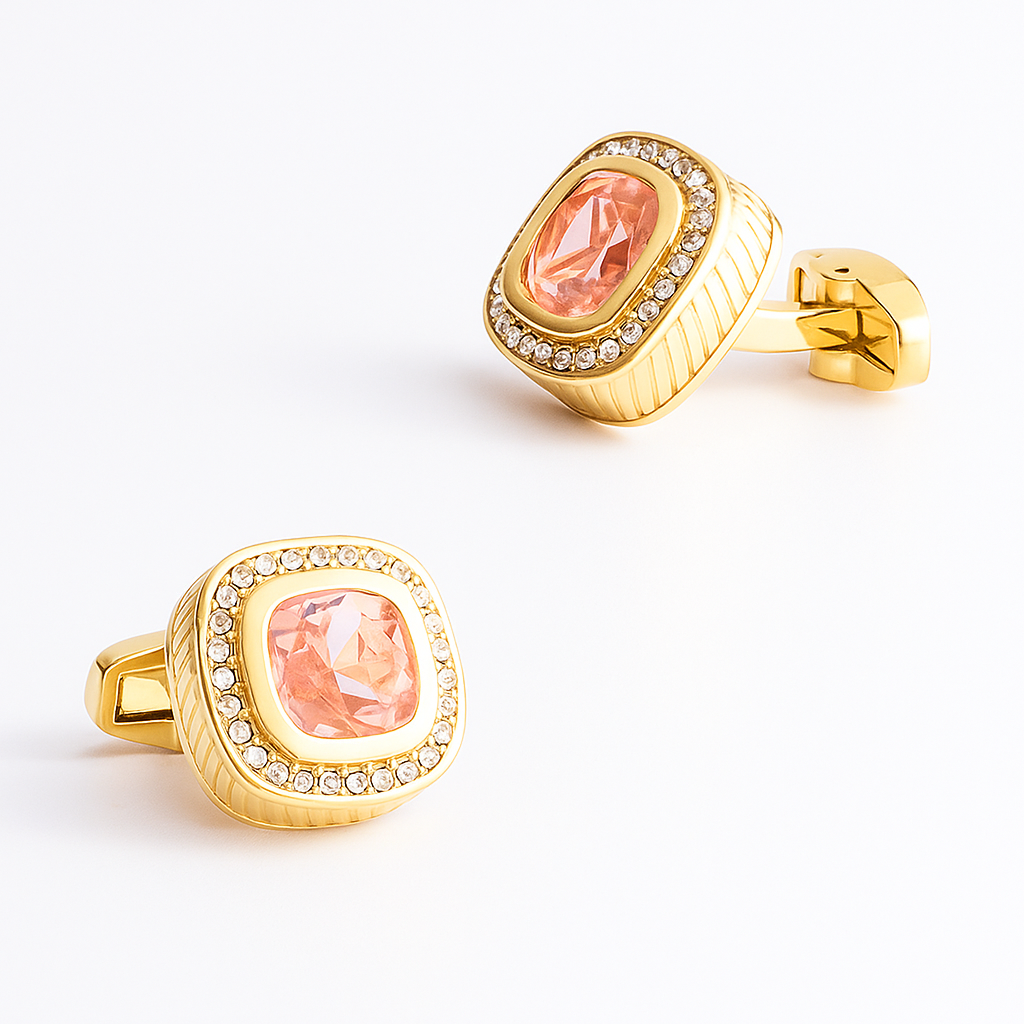 Elevate your formal look with our Regal Opulence Gold Cufflinks. Crafted with precision, each cufflink features a vibrant peach-hued gemstone at its center, surrounded by a halo of sparkling clear crystals set in polished gold-tone metal. The intricate design and luxurious finish make these cufflinks the perfect statement accessory for black-tie events and distinguished occasions. Add a touch of sophistication and unmatched elegance to your attire with these timeless cufflinks.