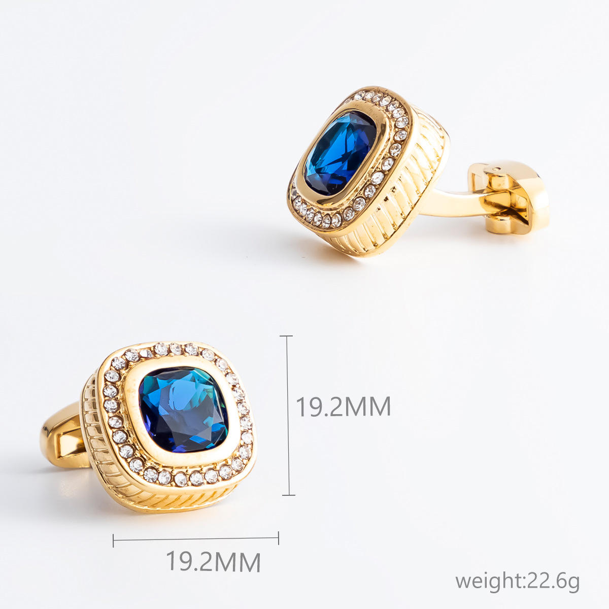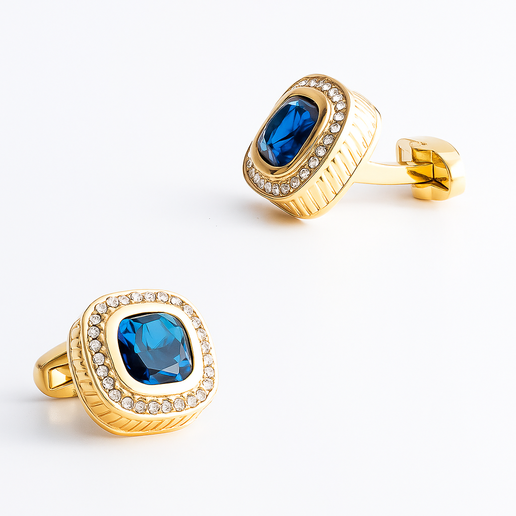 Elevate your formal attire with our exquisite Royal Azure Gold Cufflinks, a testament to timeless sophistication and distinguished style. Each cufflink features a captivating square-cut blue stone at its heart, encircled by a brilliant halo of shimmering clear stones that catch the light with every movement, adding a touch of opulent sparkle.