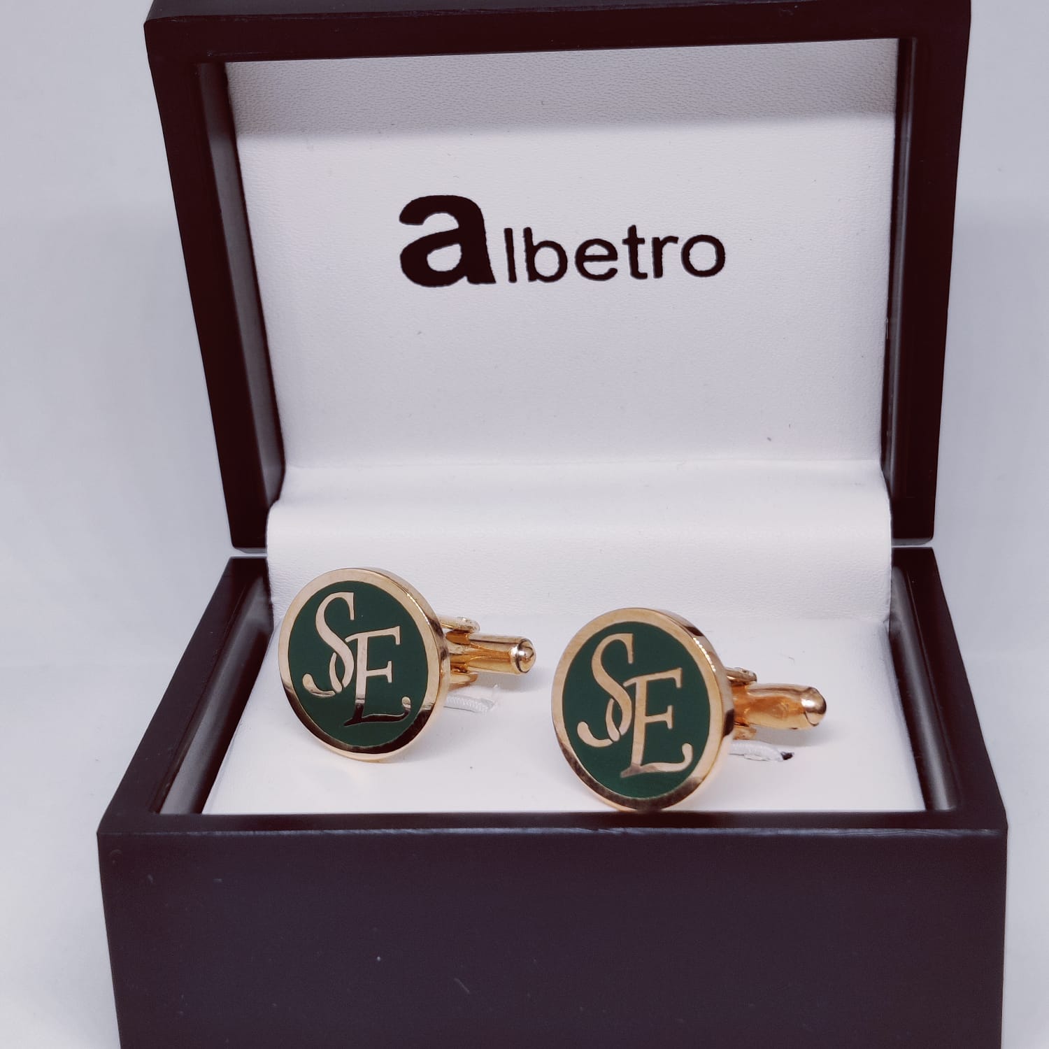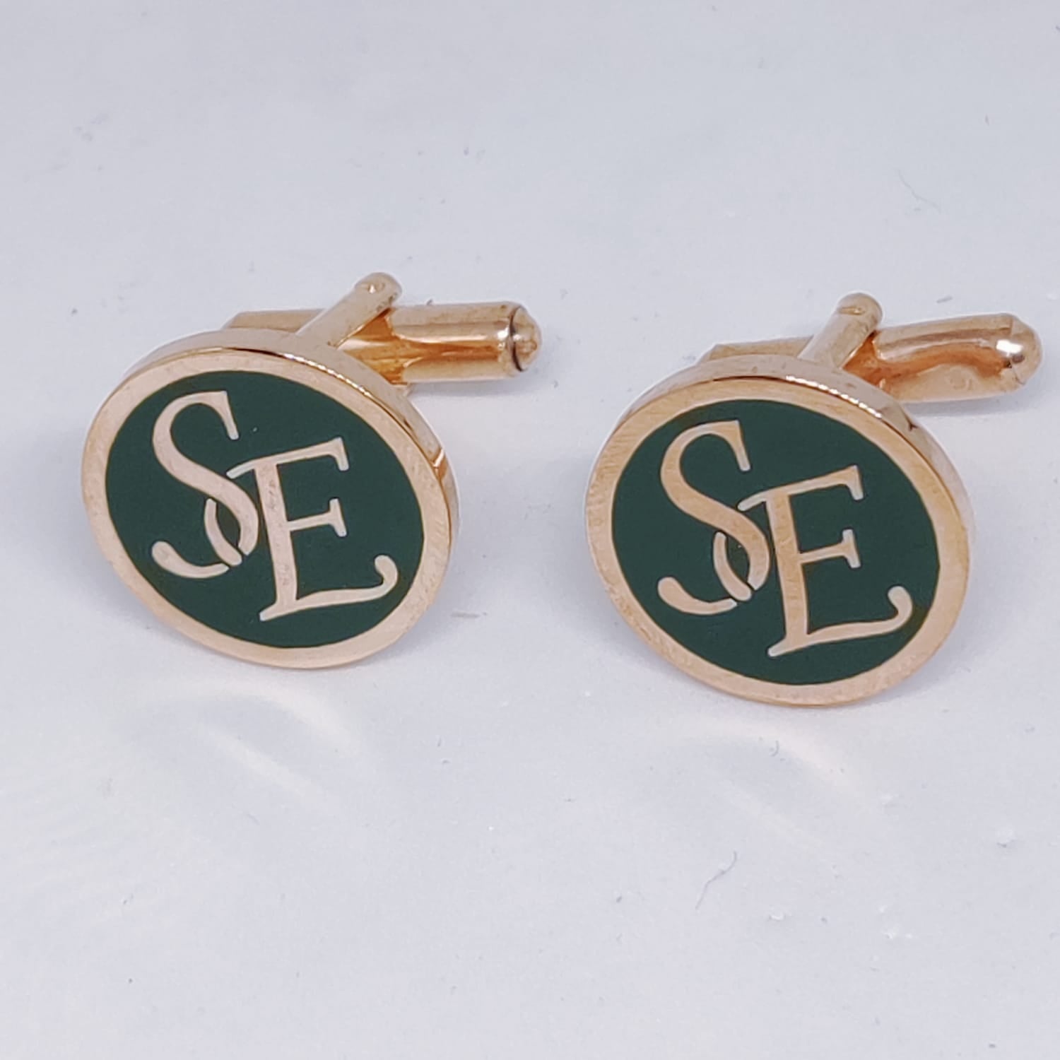 Crafted with precision and expertise, these SE Initial Monogram Cufflinks are made of high quality brass and coated with elegant rose gold plating. The addition of green enamel adds a touch of sophistication to any outfit. Enhance your personal style with these stylish and durable cufflinks.