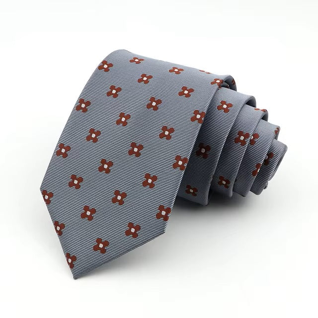 Understated elegance meets contemporary charm in the Siena Ember tie. With a cool grey canvas adorned by repeating terracotta-red floral motifs, this 8 cm tie offers a distinctive yet balanced style statement. Woven from high-quality polyester, it provides a smooth texture and structured drape—ideal for those who appreciate minimalism with an artistic touch.