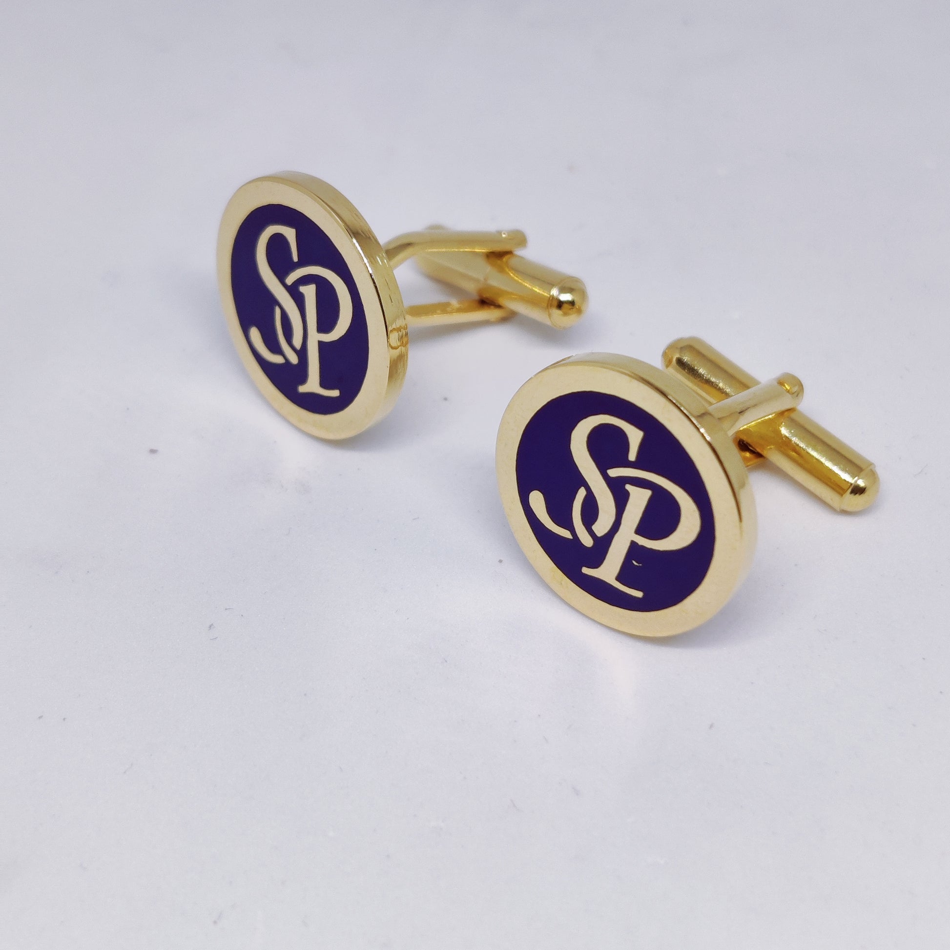 Dress up your wardrobe with our SP Initial Monogram Cufflinks. Crafted with brass, gold plating, and bold blue enamel, these cufflinks add a touch of sophistication to any outfit. Perfect for the modern man who wants to make a statement. Upgrade your style and make a lasting impression with our cufflinks.