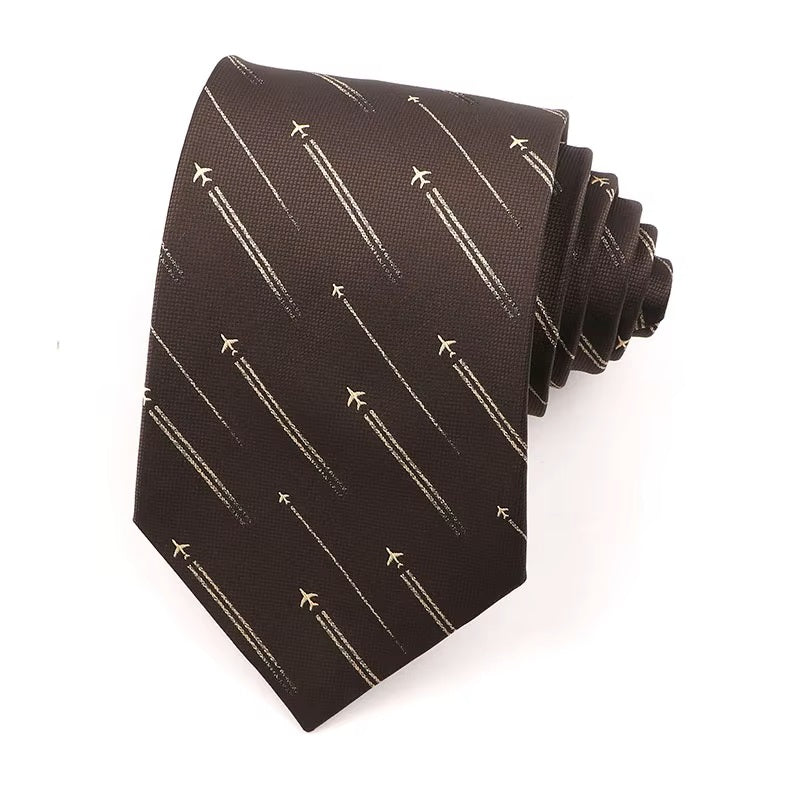 Elevate your style and let your fashion take flight with The Jetstream Tie. Designed for those who love travel, aviation, or simply want to add a dynamic edge to their wardrobe, this rich brown tie features embroidered jet planes with contrails streaking across in sleek symmetry.