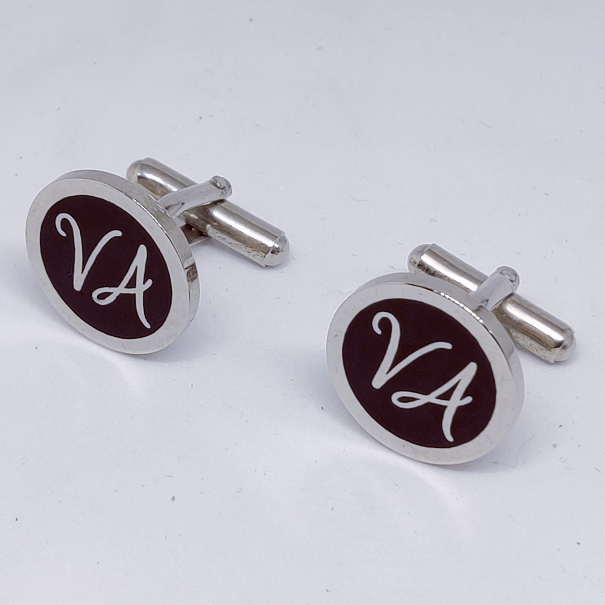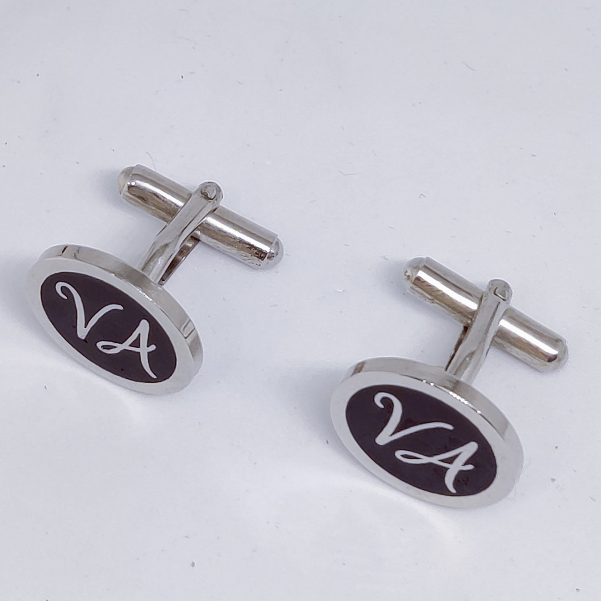 Crafted from brass with a sleek silver electroplating and black enamel, these VA initial monogram cufflinks are a stylish addition to any outfit. Perfect for adding a touch of sophistication and personalization to your look. Made with high quality materials for a long-lasting accessory.
