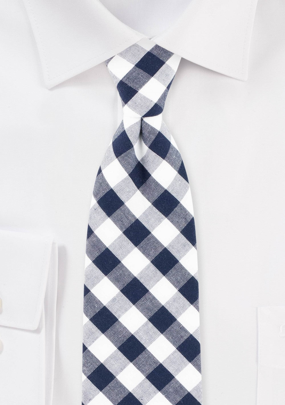 Feelin' funky? Are you the type of person who likes to put a fresh spin on old patterns and types of clothing? Then have we got a tie for you! This type of gingham dates back to the 1800s but nowadays is used in school uniforms in the UK. You can be the one to subvert expectations by wearing our Navy and White Gingham Check Cotton Tie in a professional - or even casual! - setting.